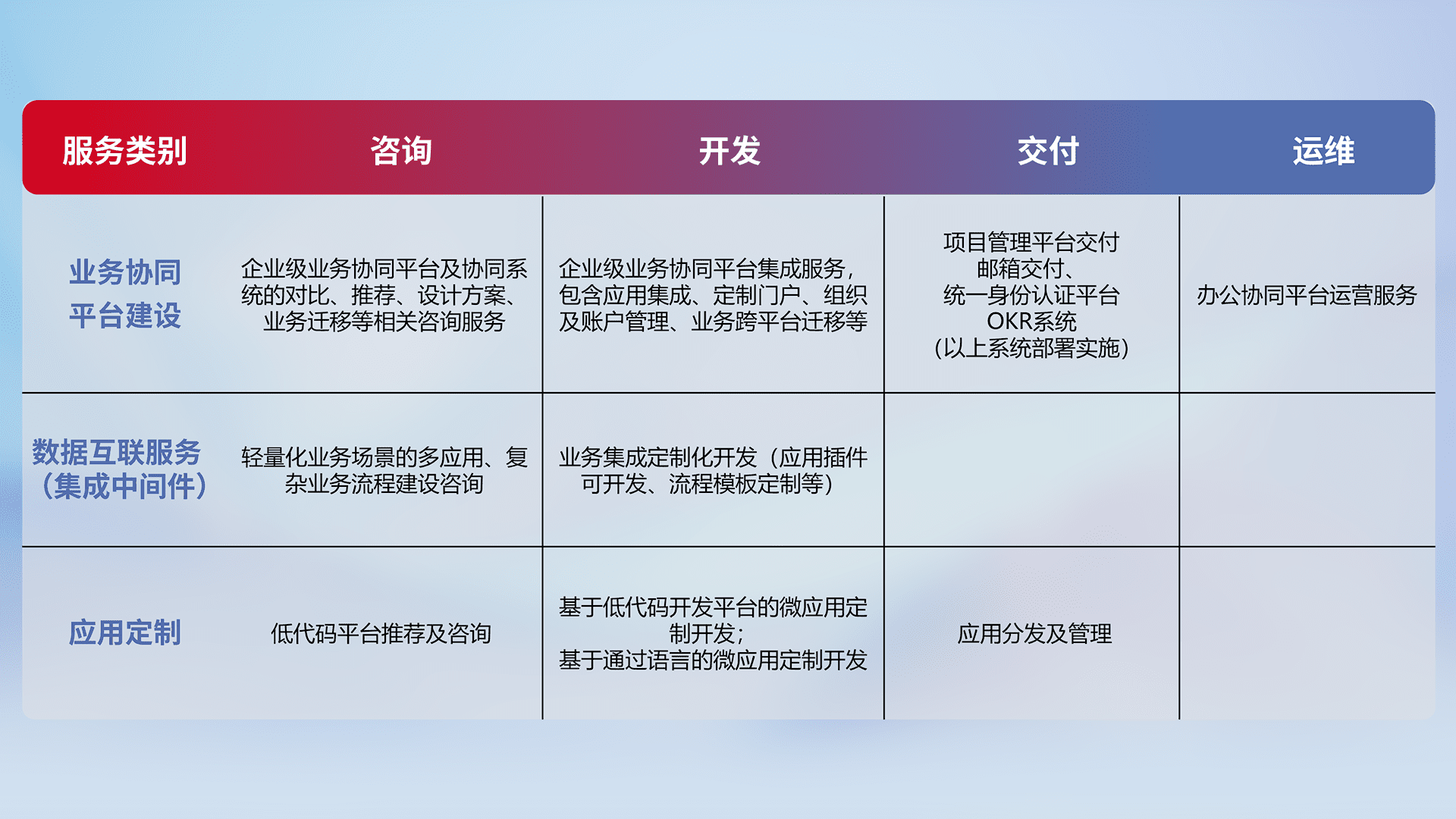 针对钉钉、、、、企微、、、、IDaas等平台级产品提供产品的规划、、、方案、、交付、、、、定制化开发等服务,,实现如统一协同办公、、、、智能客户服务、、混合会议管理、、、智能数据查询、、、、等业务场景,,,实现数字化转型。。。